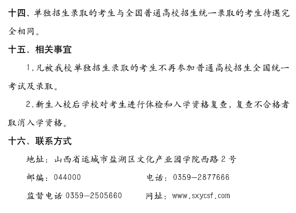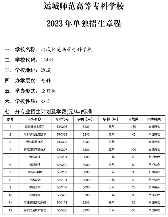 运城师范高等专科学校2023单独招生章程